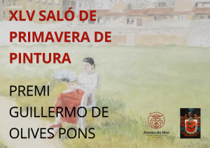 XLV Premi de pintura Guillermo de Olives Pons – Saló Primavera 2026 Aquest premi pretén posar en valor la creativitat pictòrica i es premiaran les obres elegides pel jurat amb medalla d’or, dotada amb 5.000 €, i una menció honorífica, dotada amb 2.000€. Les obres premiades seran adquirides per l’Ateneu sense que l’autor rebi altra ... Llegiu més