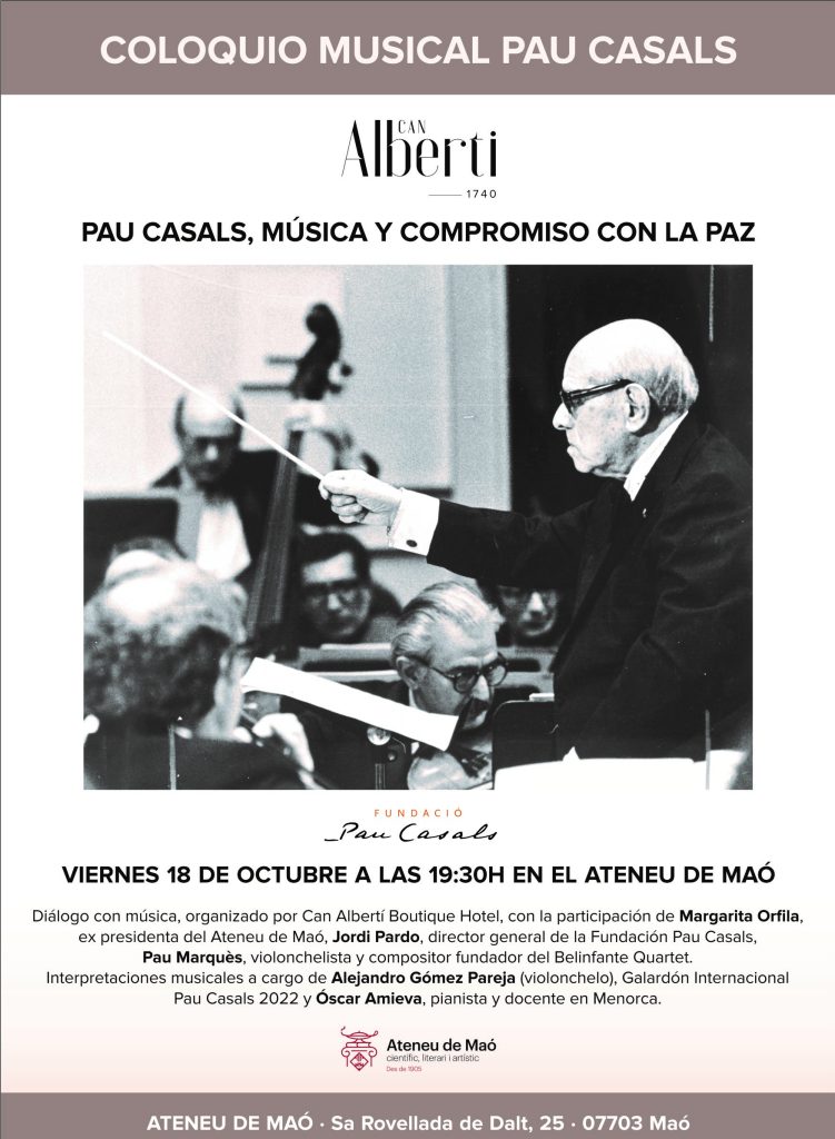Diálogo con música, organizado por Can Albertí Boutique Hotel, con la participación de Margarita Orfila, ex presidenta del Ateneu de Maó, Jordi Pardo, director general de la Fundación Pau Casals y Pau Marquès, violonchelista y compositor fundador del Belinfante Quartet.